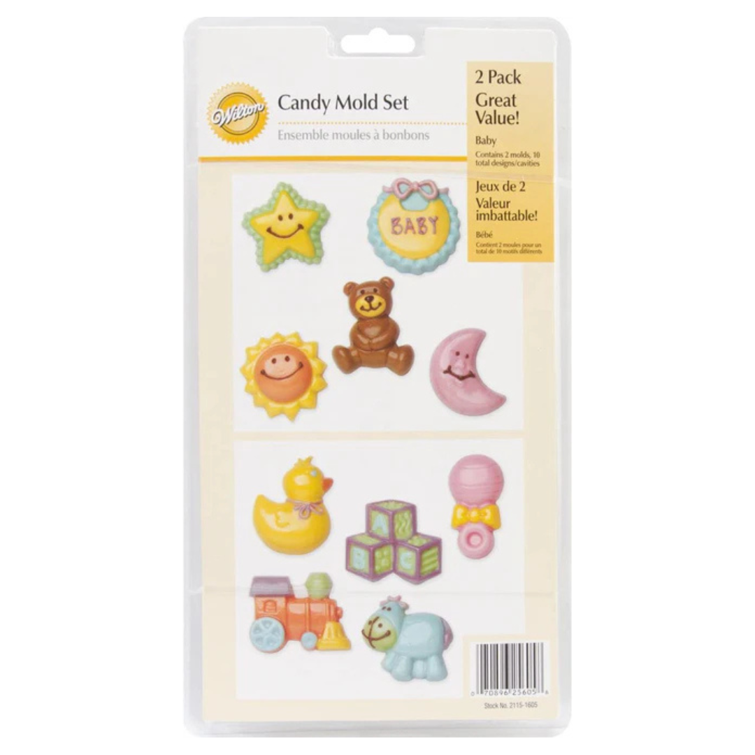 This Baby Candy Mold from Wilton makes it easier to create fun treats for a baby shower or other party. There are shapes such as a teddy bear, a rattle, a train and more. Each Wilton candy mold has five shapes, making a 10-cavity total. There are 10 designs to choose from.