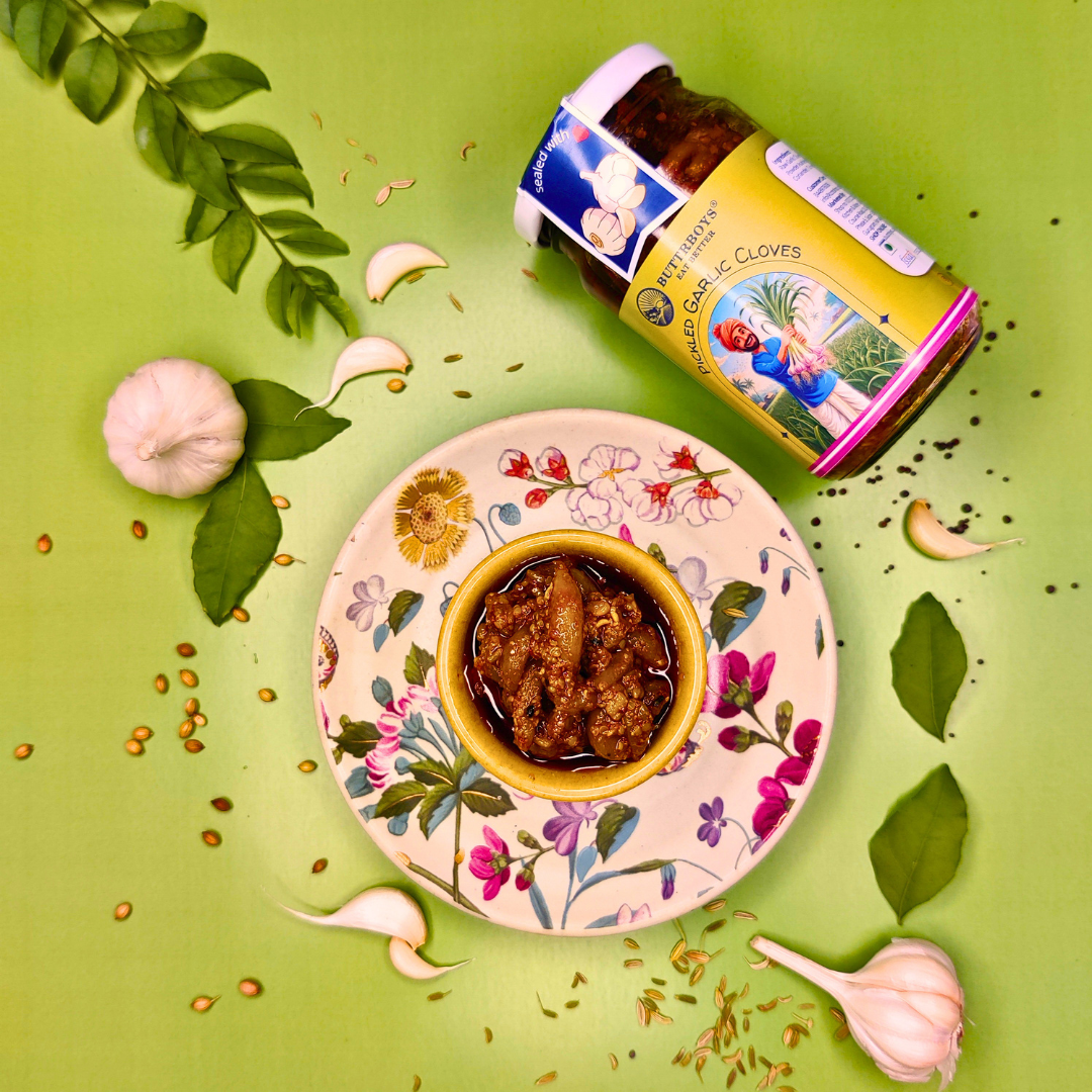 ·        Relish the robust flavour of whole garlic cloves, pickled to perfection for a bold, tangy punch that transforms any dish. Whole naturally grown cloves aged under the sun submerged in spices and time, until they soften into something rich, mellow, and deeply familiar.