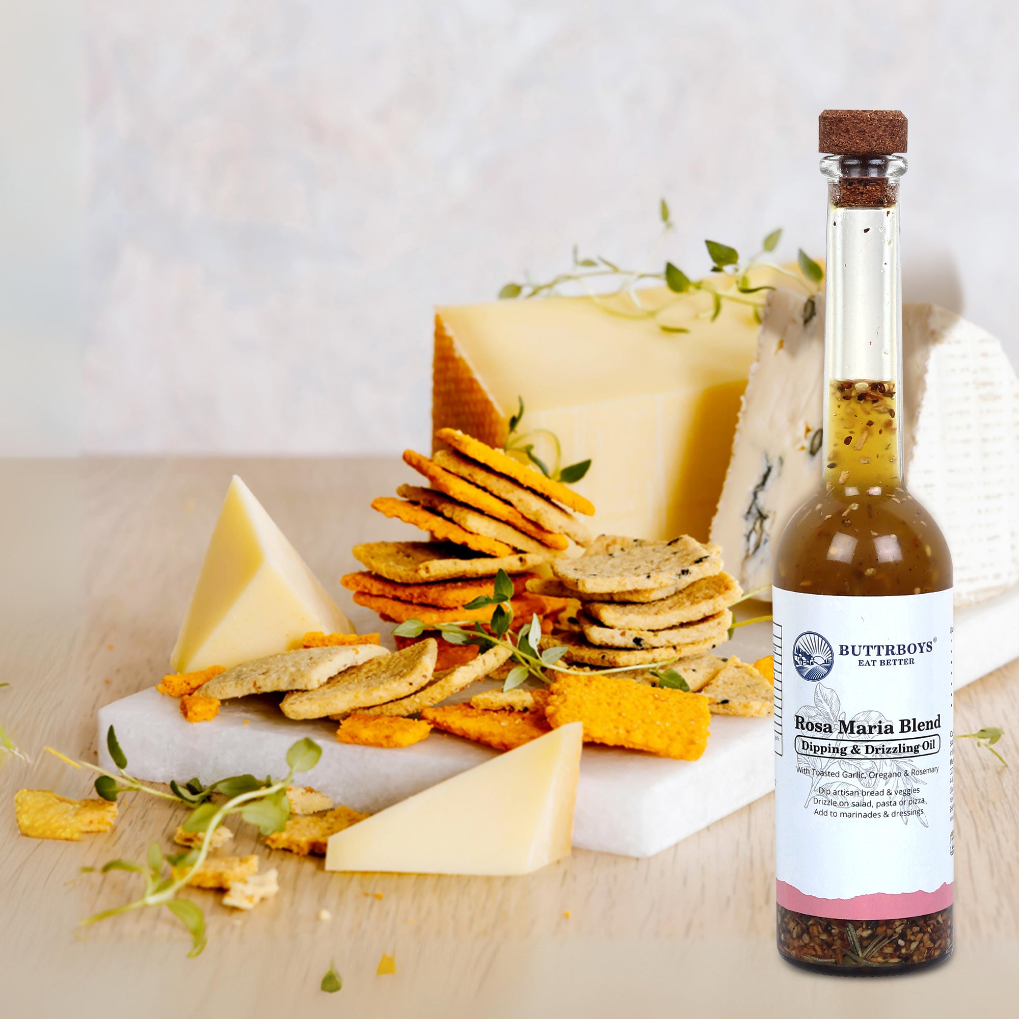 Bring the heart of the Mediterranean to your kitchen with the ButtrBoys Rosa Maria Blend. This exquisite dipping and drizzling oil combines the aromatic, time-honoured flavours of Rosemary and Oregano with the savoury warmth of Toasted Garlic. It’s the essential addition for those who want to ""Eat  Better"" by infusing simple meals with vibrant, sophisticated flavour.