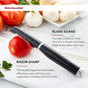 Peel veggies, fruit, and more with this euro-peeler. A high carbon stainless steel blade, it features a vibrant red handle. This peeler is backed by a manufacturer's one year hassle-free replaceable and lifetime warranty. Dishwasher safe, it makes for easy clean up.