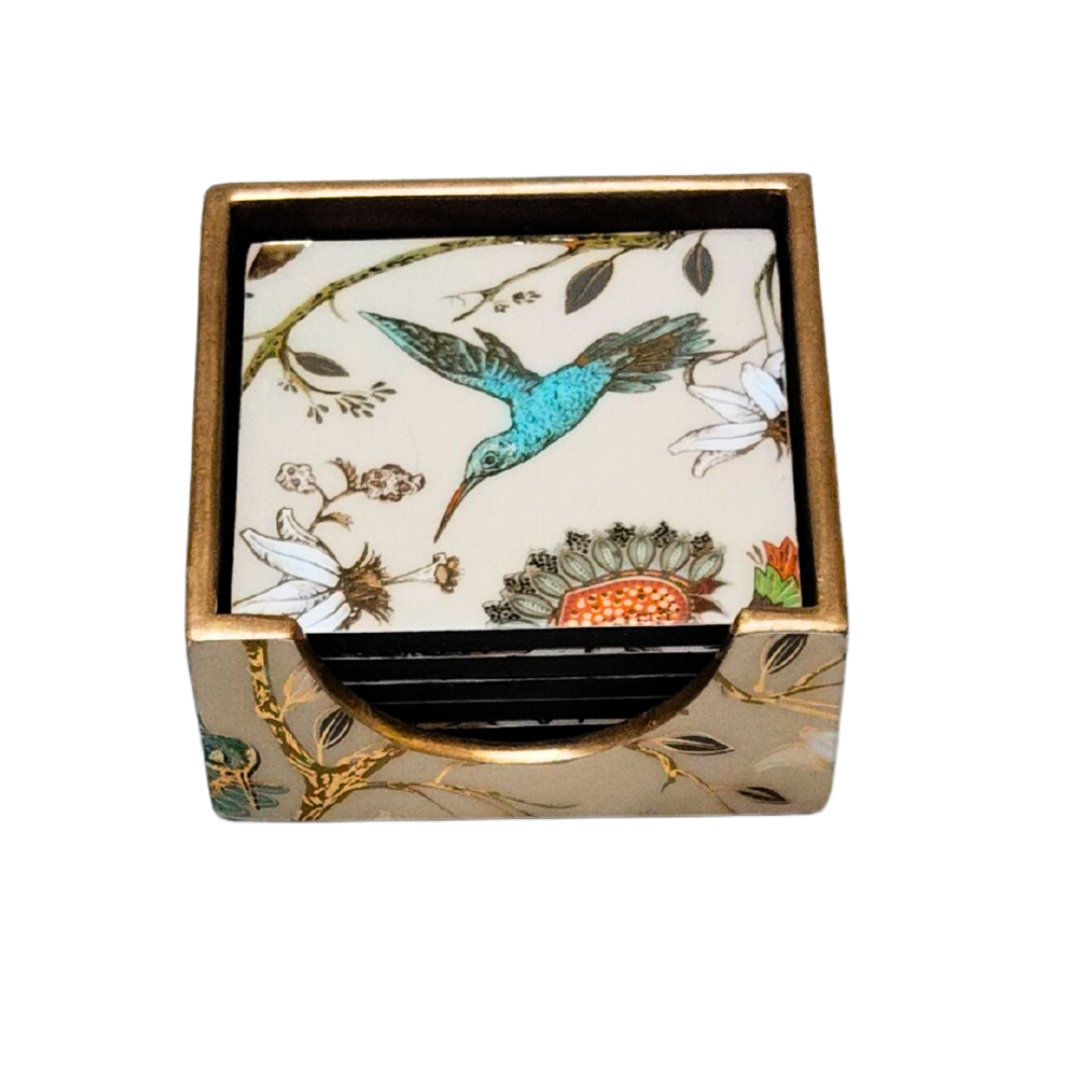 Invite the elegance of nature into your home with this beautifully illustrated coaster set. Featuring a delicate hummingbird in flight surrounded by intricate floral details, this set is designed to blend artistic beauty with everyday functionality.